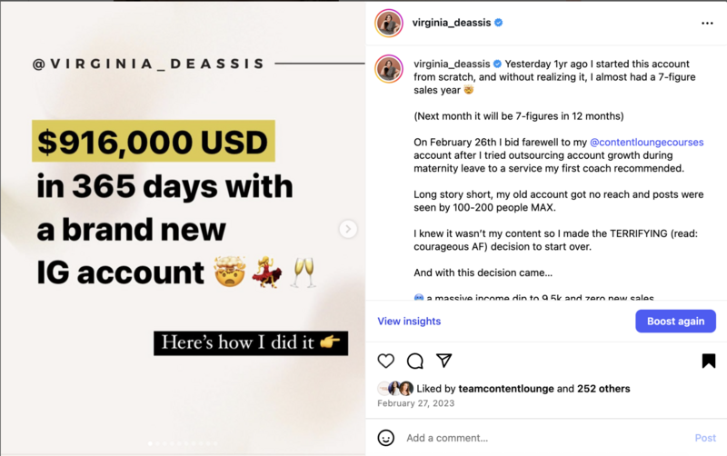 "I thought success stories like this were fake until it happened to me. I wrote my first post using Virginia's method and signed a 1-on-1 client right away. I had always heard those stories and never believed them, but now I've experienced it myself."